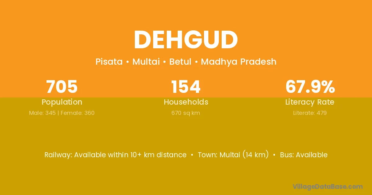 Multai (14 km) is the nearest town to Dehgud village for major economic activities and is located approximately 14 km away.