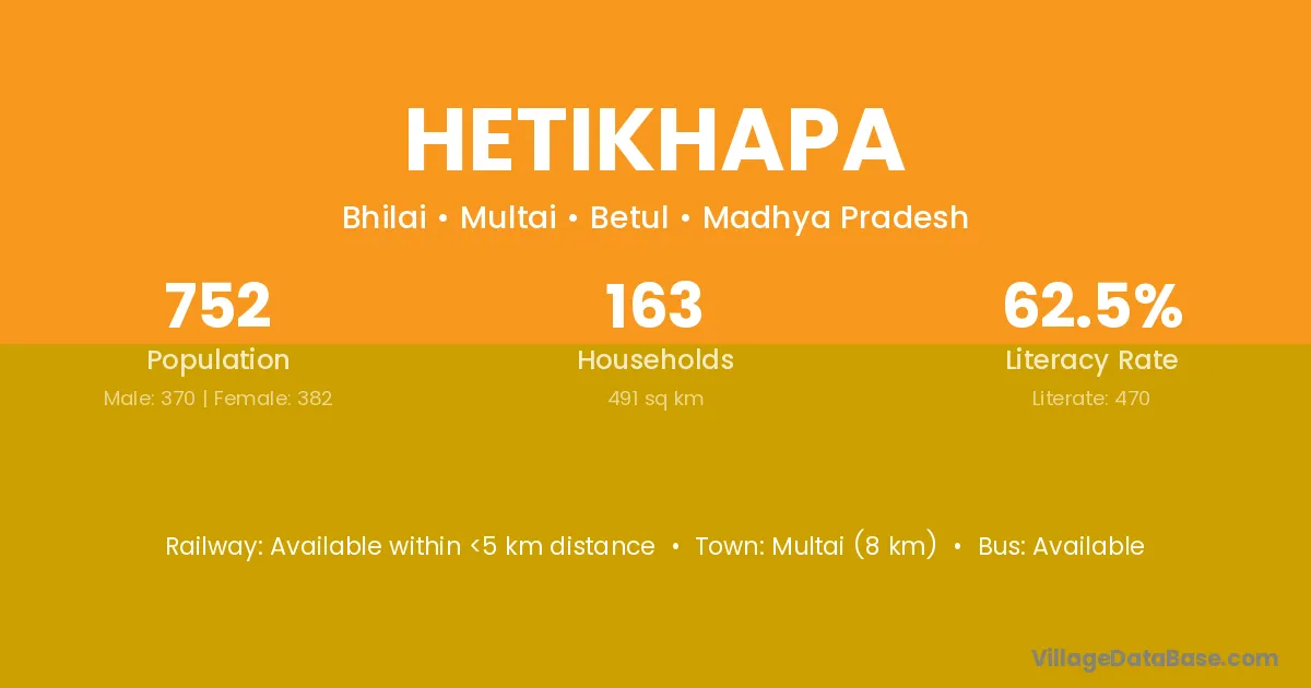 Multai (8 km) is the nearest town to Hetikhapa village for major economic activities and is located approximately 8 km away.