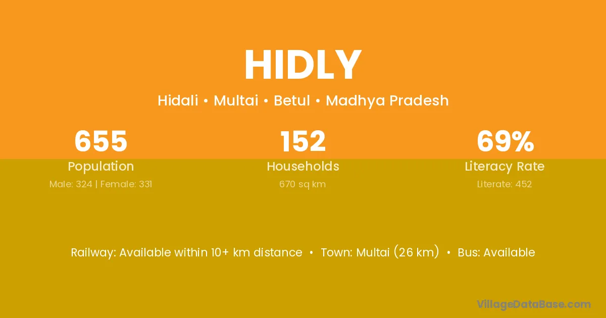 Multai (26 km) is the nearest town to Hidly village for major economic activities and is located approximately 26 km away.