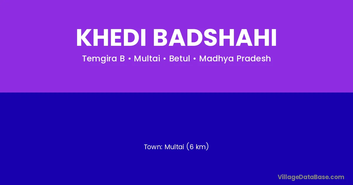 Multai (6 km) is the nearest town to Khedi Badshahi village for major economic activities and is located approximately 6 km away.