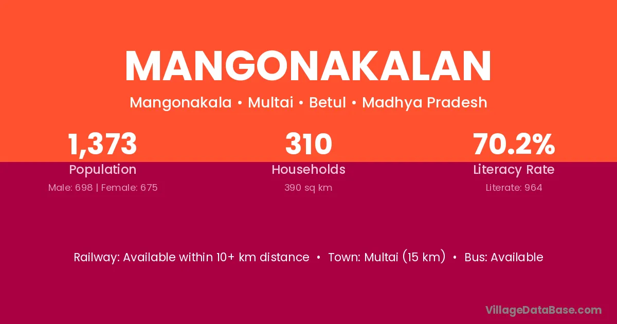 Multai (15 km) is the nearest town to Mangonakalan village for major economic activities and is located approximately 15 km away.