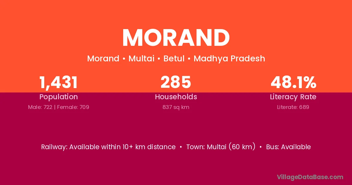 Multai (60 km) is the nearest town to Morand village for major economic activities and is located approximately 60 km away.
