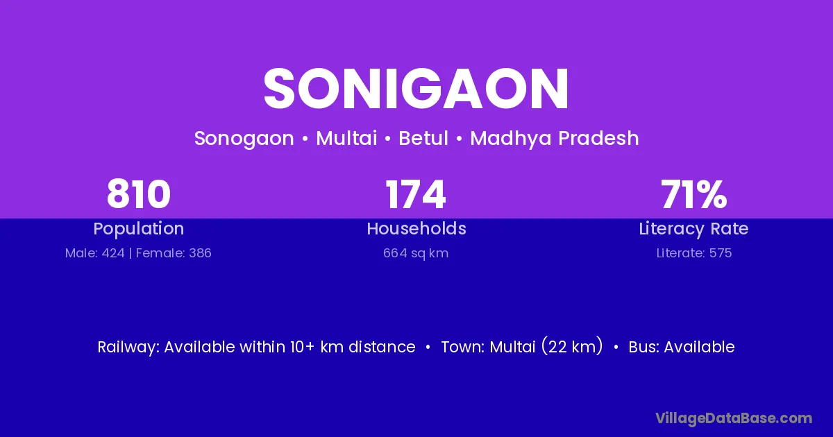 Multai (22 km) is the nearest town to Sonigaon village for major economic activities and is located approximately 22 km away.