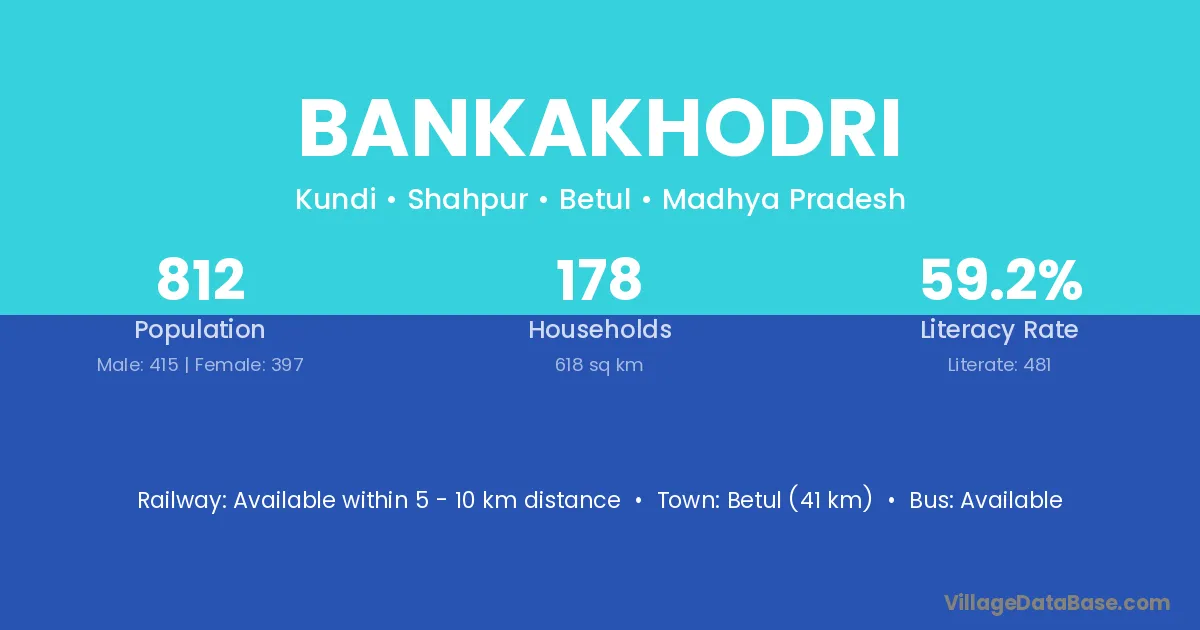 Betul (41 km) is the nearest town to Bankakhodri village for major economic activities and is located approximately 41 km away.