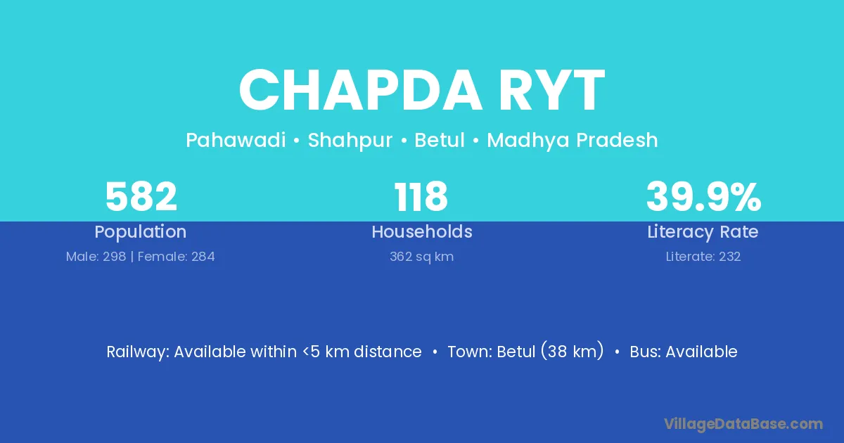 Betul (38 km) is the nearest town to Chapda Ryt village for major economic activities and is located approximately 38 km away.