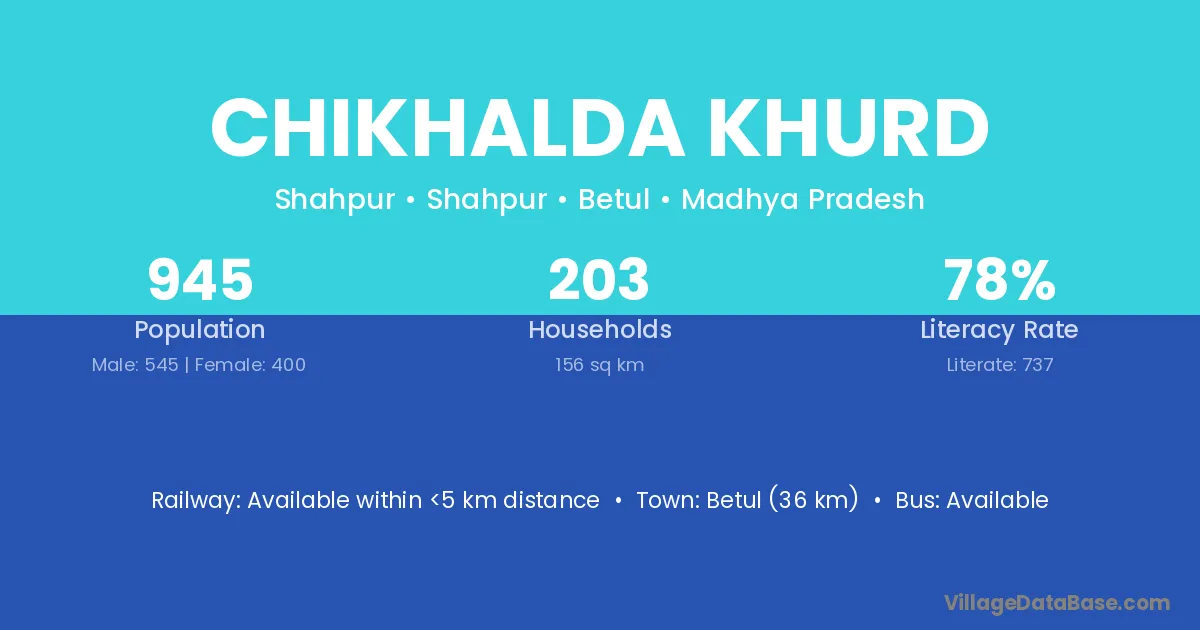 Chikhalda Khurd village has a total population of 945 people, of which 545 are males and 400 are females.