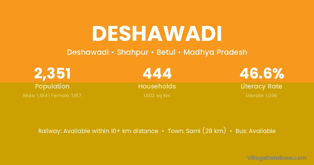 Sarni (28 km) is the nearest town to Deshawadi village for major economic activities and is located approximately 28 km away.