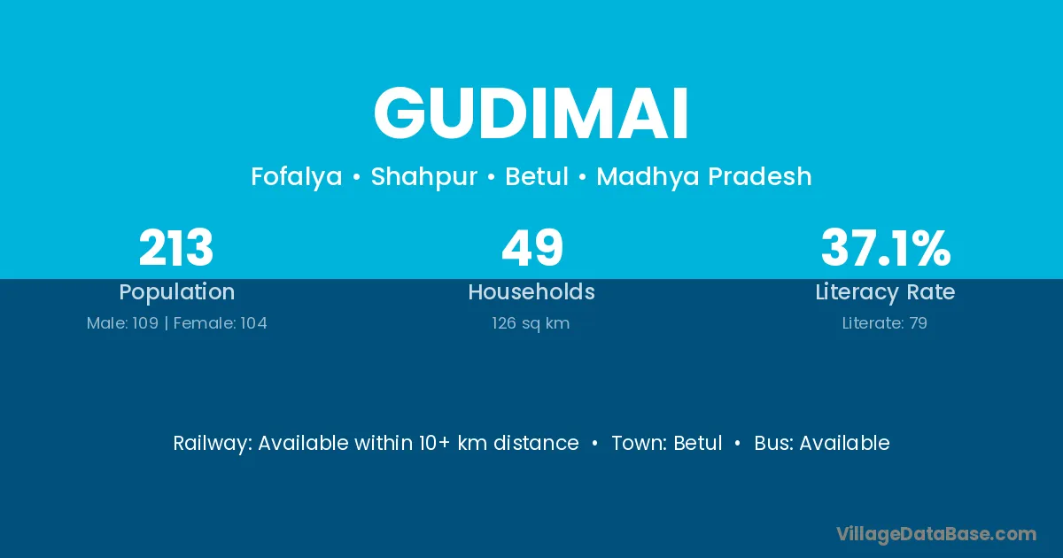 Gudimai village has a total population of 213 people, of which 109 are males and 104 are females.