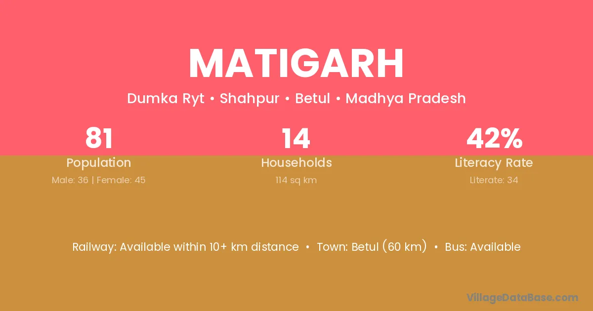 Betul (60 km) is the nearest town to Matigarh village for major economic activities and is located approximately 60 km away.
