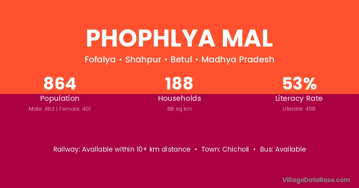Phophlya Mal village has a total population of 864 people, of which 463 are males and 401 are females.