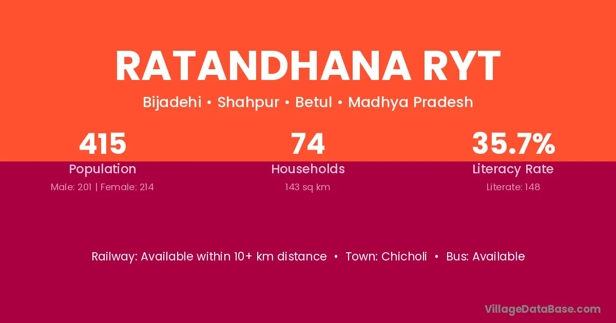 Ratandhana Ryt village has a total population of 415 people, of which 201 are males and 214 are females.