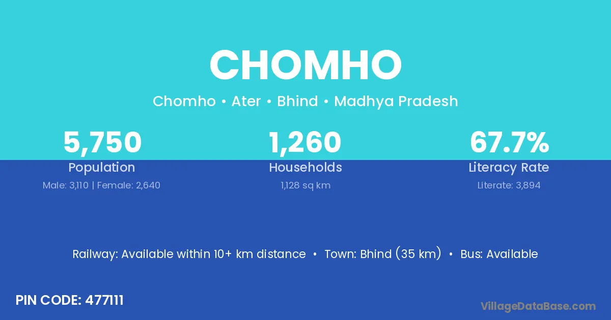 Bhind (35 km) is the nearest town to Chomho village for major economic activities and is located approximately 35 km away.