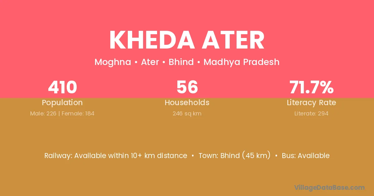 Bhind (45 km) is the nearest town to Kheda Ater village for major economic activities and is located approximately 45 km away.