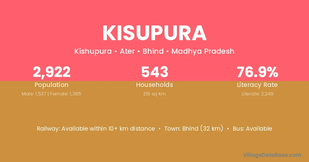 Bhind (32 km) is the nearest town to Kisupura village for major economic activities and is located approximately 32 km away.