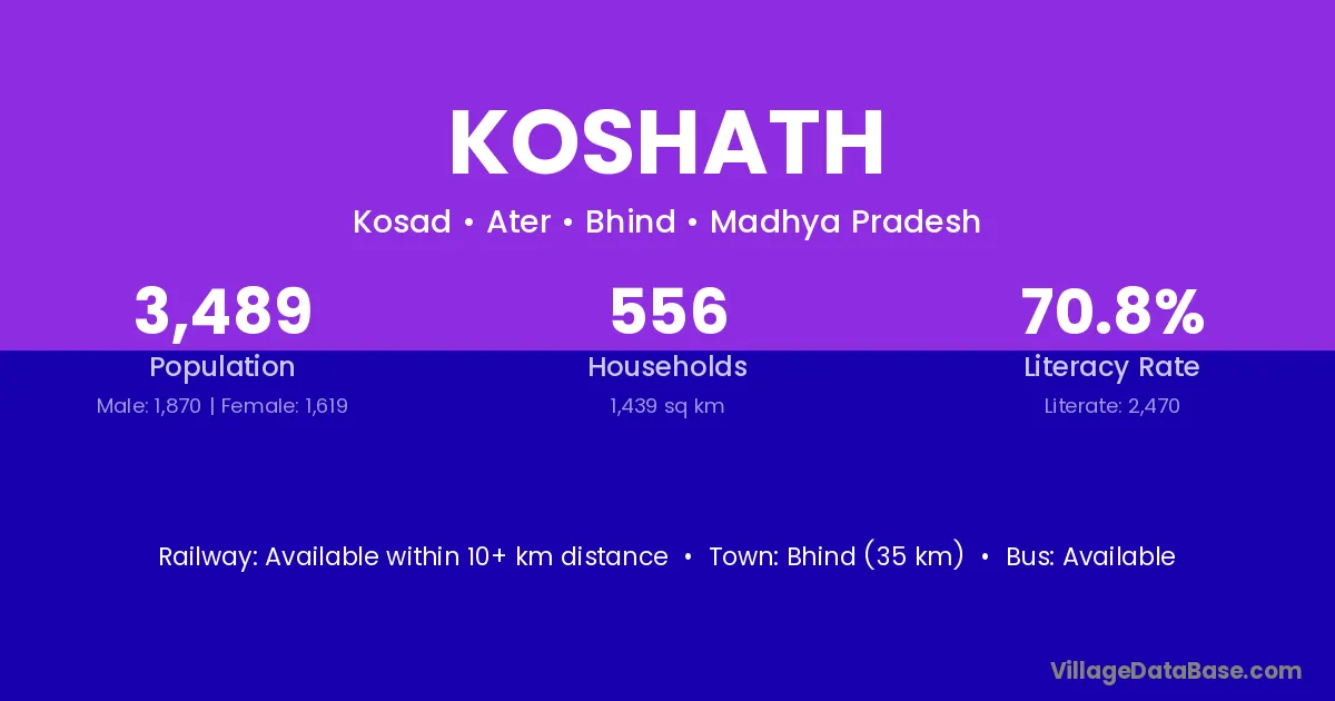 Bhind (35 km) is the nearest town to Koshath village for major economic activities and is located approximately 35 km away.