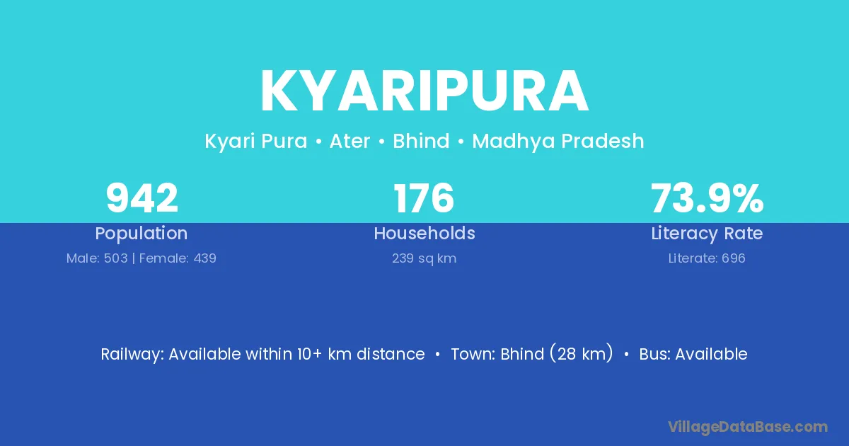 Bhind (28 km) is the nearest town to Kyaripura village for major economic activities and is located approximately 28 km away.