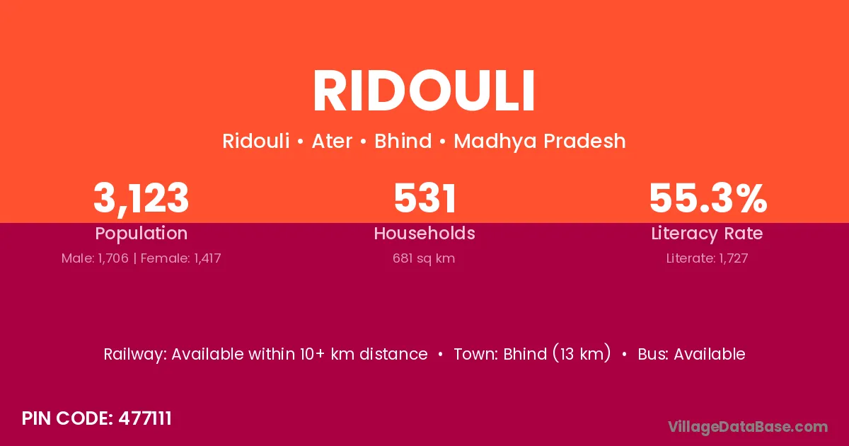 Bhind (13 km) is the nearest town to Ridouli village for major economic activities and is located approximately 13 km away.