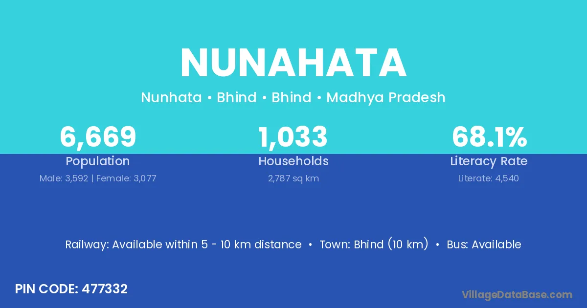 Bhind (10 km) is the nearest town to Nunahata village for major economic activities and is located approximately 10 km away.