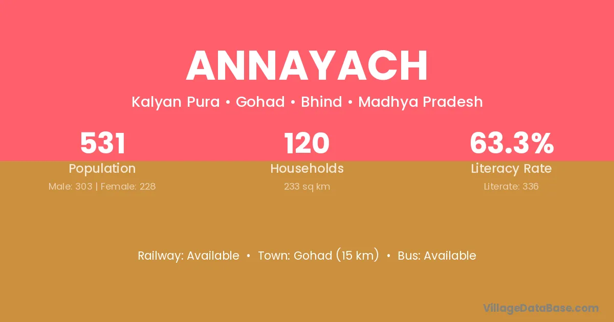 Annayach village has a total population of 531 people, of which 303 are males and 228 are females.