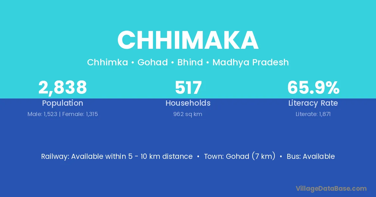 Gohad (7 km) is the nearest town to Chhimaka village for major economic activities and is located approximately 7 km away.