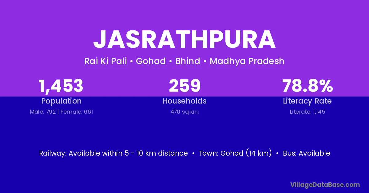 Gohad (14 km) is the nearest town to Jasrathpura village for major economic activities and is located approximately 14 km away.