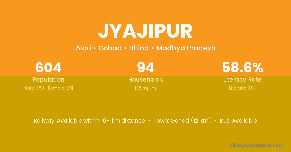 Jyajipur village has a total population of 604 people, of which 353 are males and 251 are females.
