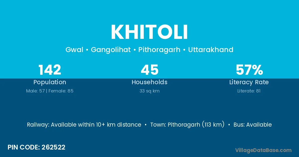 The literacy rate of Khitoli village is 54.52%. Male literacy stands at 67.44% and female literacy at 38.62%.