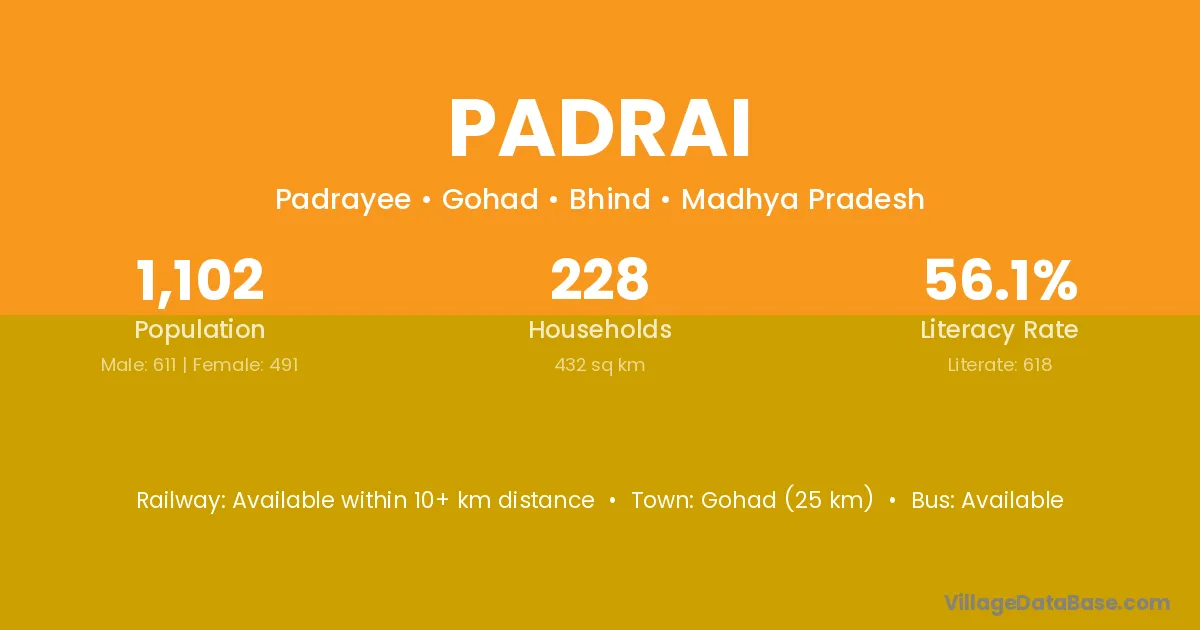 Gohad (25 km) is the nearest town to Padrai village for major economic activities and is located approximately 25 km away.