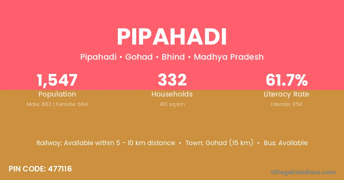Gohad (15 km) is the nearest town to Pipahadi village for major economic activities and is located approximately 15 km away.