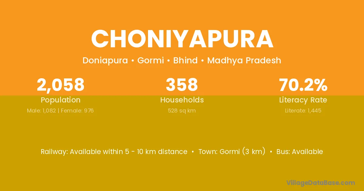 Gormi (3 km) is the nearest town to Choniyapura village for major economic activities and is located approximately 3 km away.