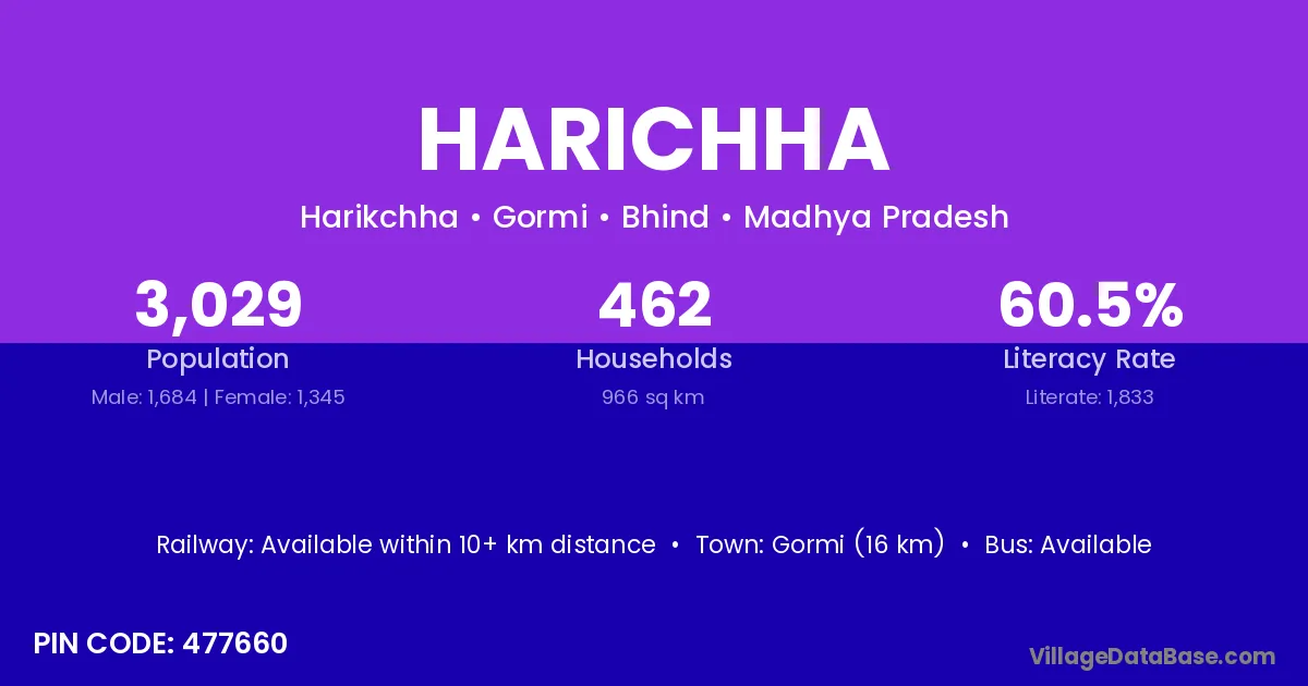 According to Census 2011 information, the village code of Harichha village is 477660.