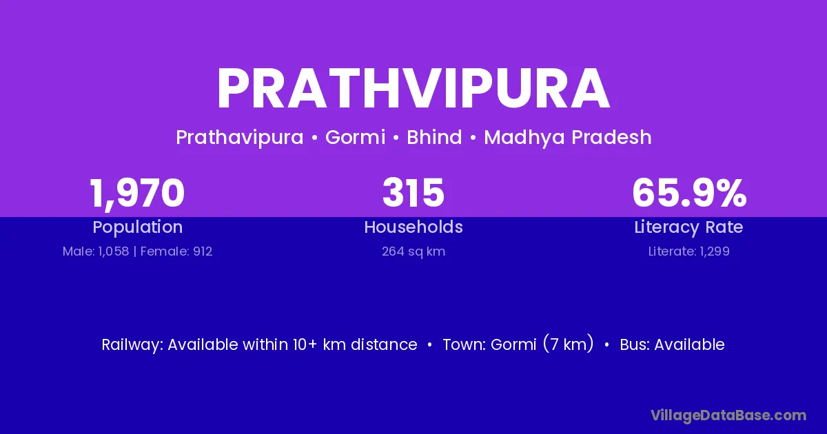 Gormi (7 km) is the nearest town to Prathvipura village for major economic activities and is located approximately 7 km away.