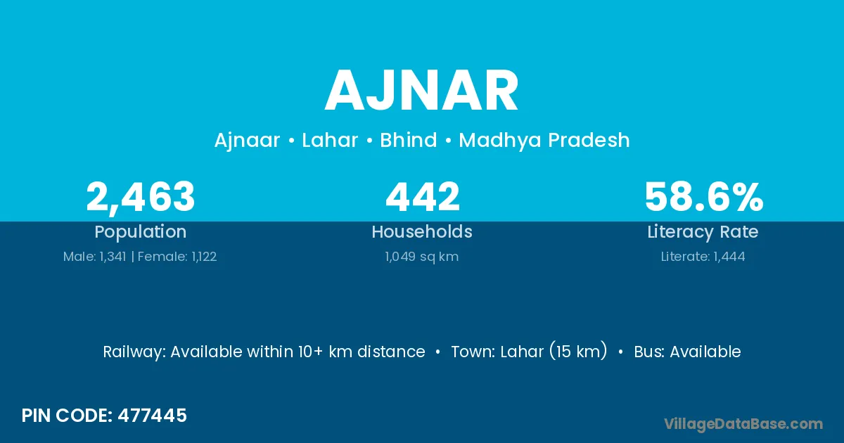 Lahar (15 km) is the nearest town to Ajnar village for major economic activities and is located approximately 15 km away.