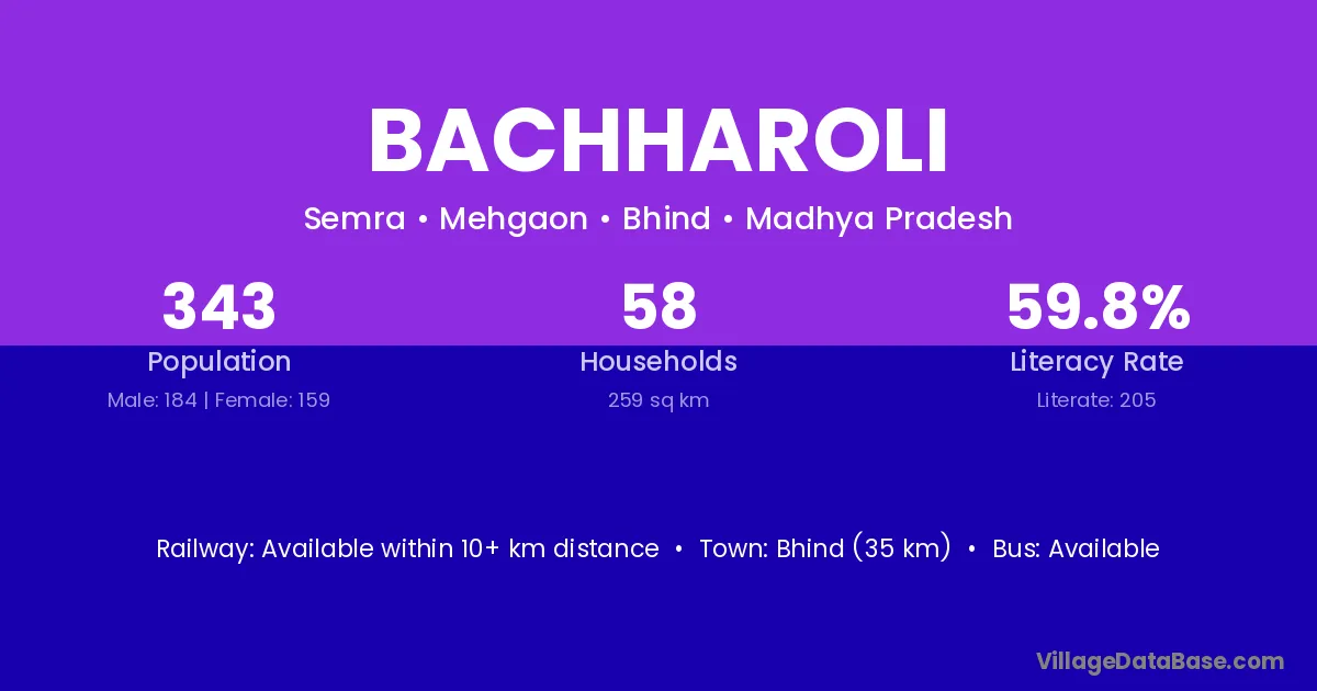 Bhind (35 km) is the nearest town to Bachharoli village for major economic activities and is located approximately 35 km away.