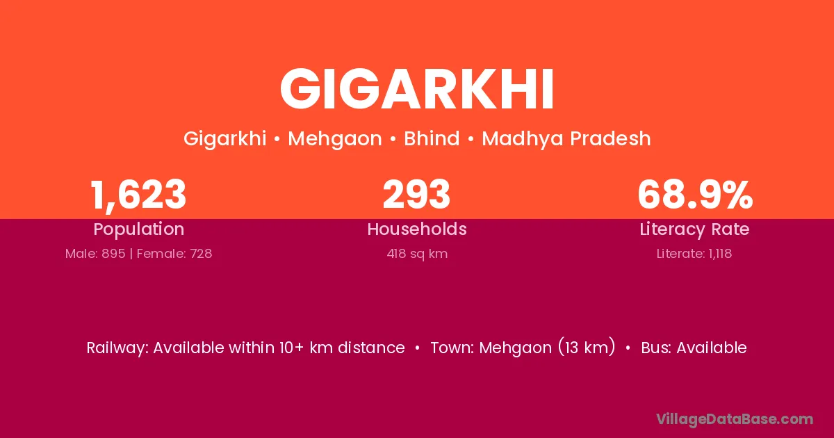 Mehgaon (13 km) is the nearest town to Gigarkhi village for major economic activities and is located approximately 13 km away.