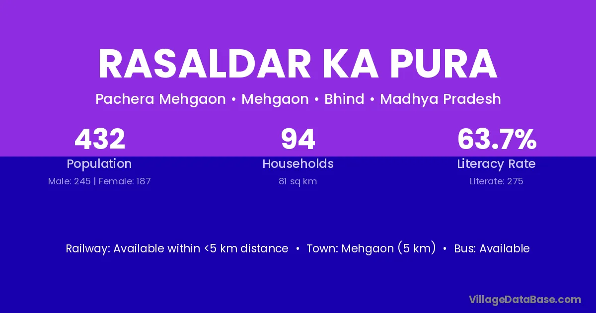 Rasaldar Ka Pura village has a total population of 432 people, of which 245 are males and 187 are females.