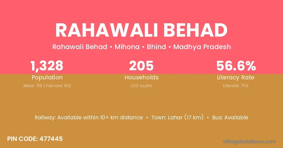 Lahar (17 km) is the nearest town to Rahawali Behad village for major economic activities and is located approximately 17 km away.