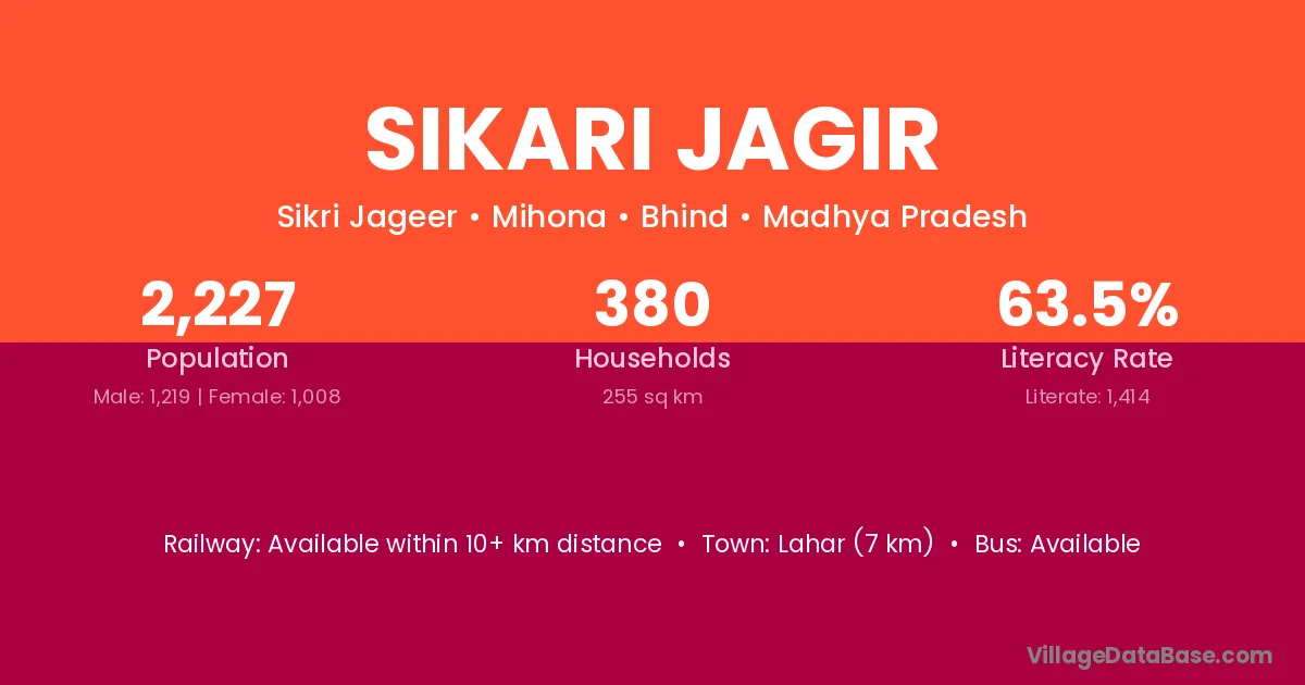 Lahar (7 km) is the nearest town to Sikari Jagir village for major economic activities and is located approximately 7 km away.