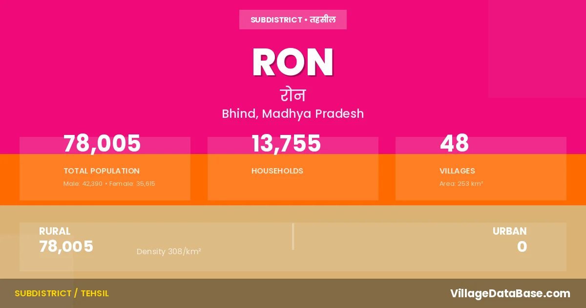 Ron is a town and Tehsil in the Bhind district of the Madhya Pradesh. In India, a Tehsil is a subdivision of a district responsible for the administration and revenue collection of a specific area within the district. Tehsils play a crucial role in the local governance structure, contributing significantly to the development and administration of their communities.