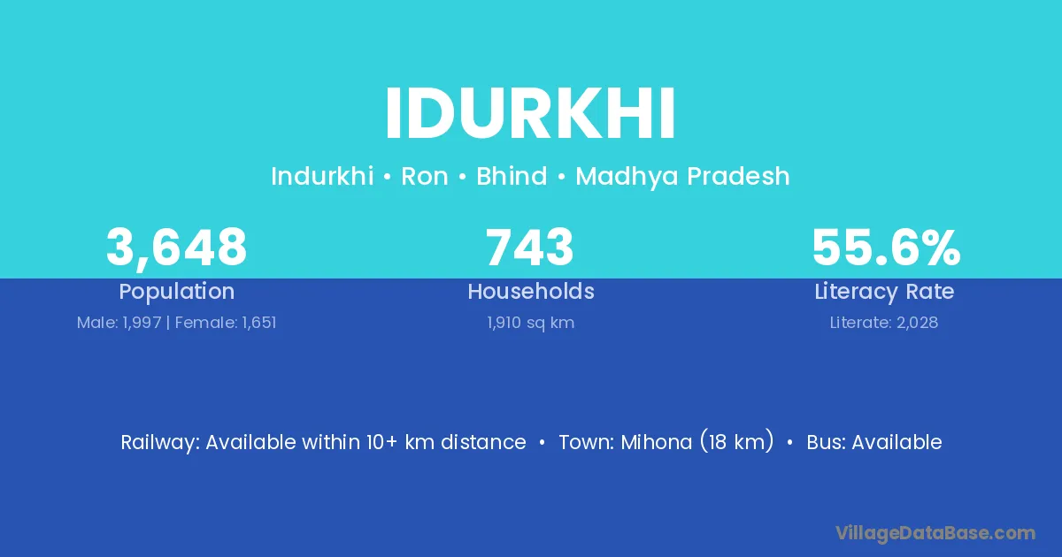 Idurkhi village has a total population of 3,648 people, of which 1,997 are males and 1,651 are females.