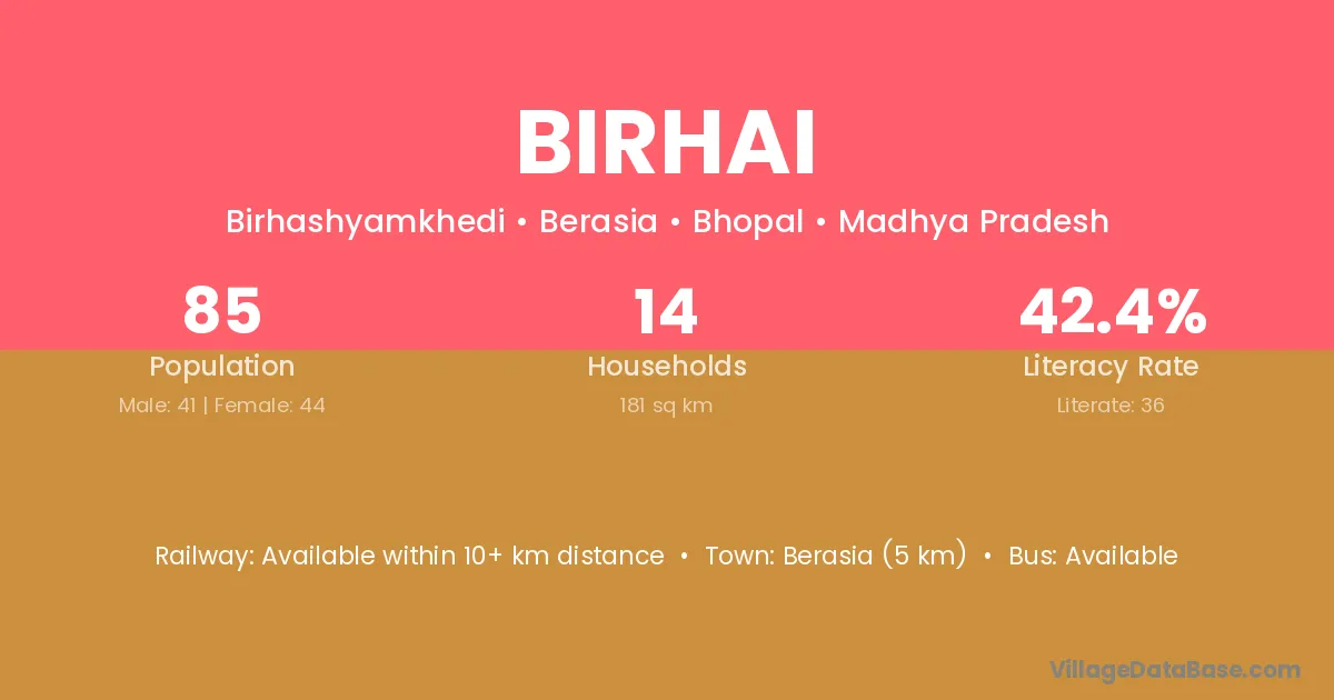 Berasia (5 km) is the nearest town to Birhai village for major economic activities and is located approximately 5 km away.