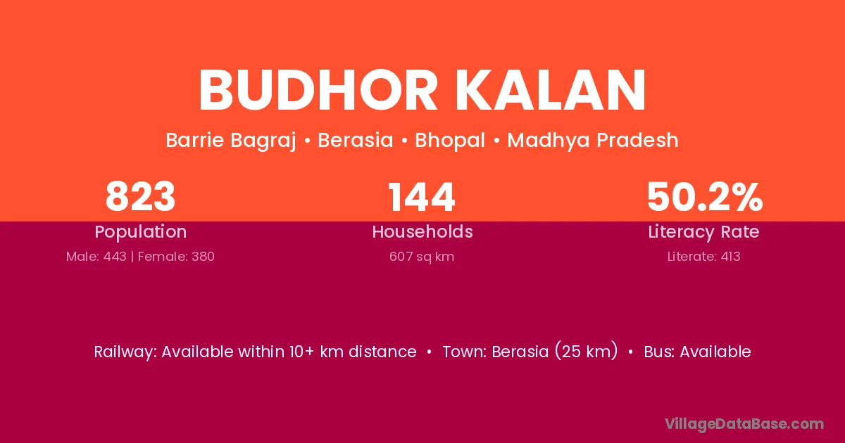 Berasia (25 km) is the nearest town to Budhor Kalan village for major economic activities and is located approximately 25 km away.