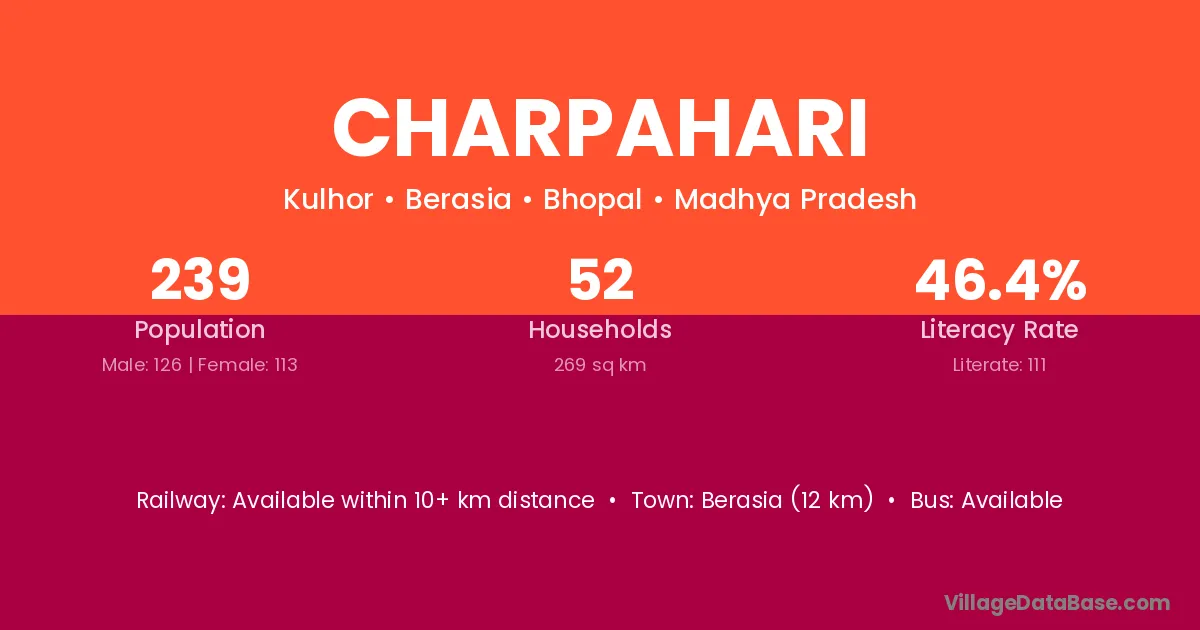 Berasia (12 km) is the nearest town to Charpahari village for major economic activities and is located approximately 12 km away.