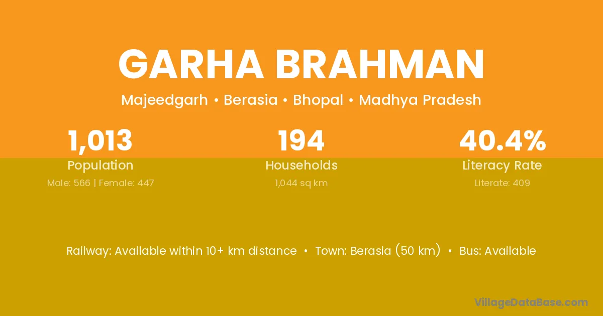 Berasia (50 km) is the nearest town to Garha Brahman village for major economic activities and is located approximately 50 km away.