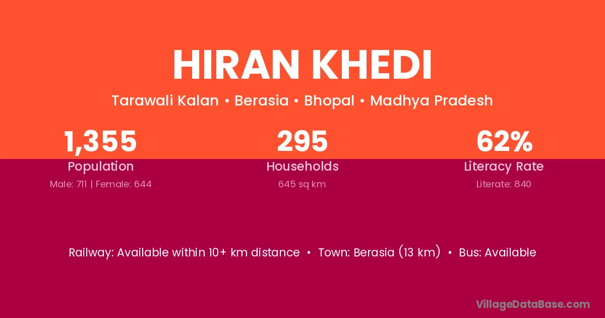 Hiran Khedi village has a total population of 1,355 people, of which 711 are males and 644 are females.