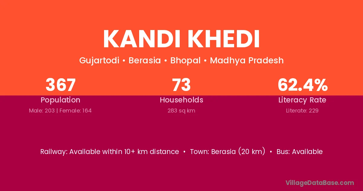 Berasia (20 km) is the nearest town to Kandi Khedi village for major economic activities and is located approximately 20 km away.