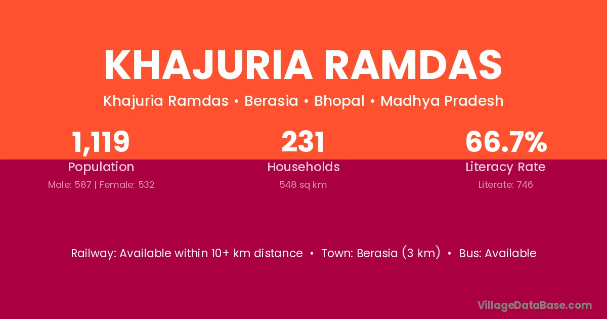 Berasia (3 km) is the nearest town to Khajuria Ramdas village for major economic activities and is located approximately 3 km away.
