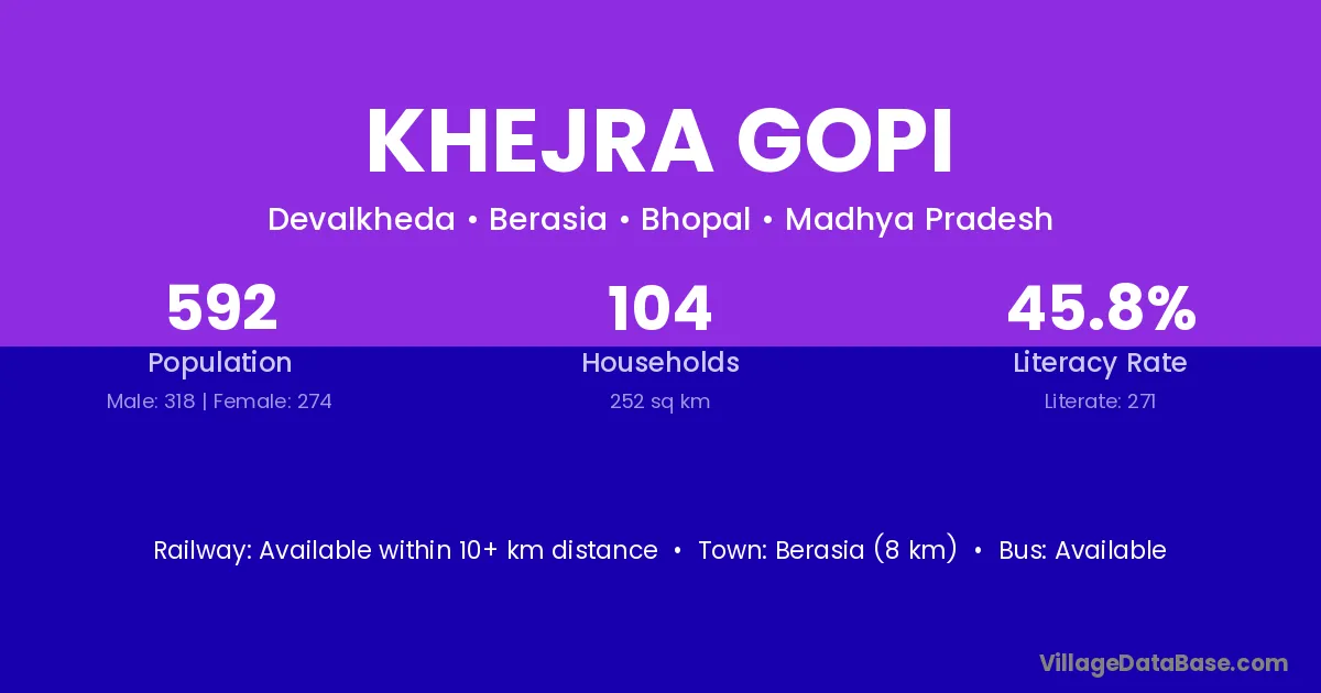 Berasia (8 km) is the nearest town to Khejra Gopi village for major economic activities and is located approximately 8 km away.