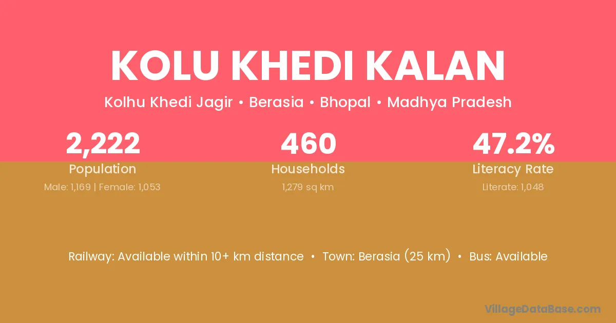 Berasia (25 km) is the nearest town to Kolu Khedi Kalan village for major economic activities and is located approximately 25 km away.