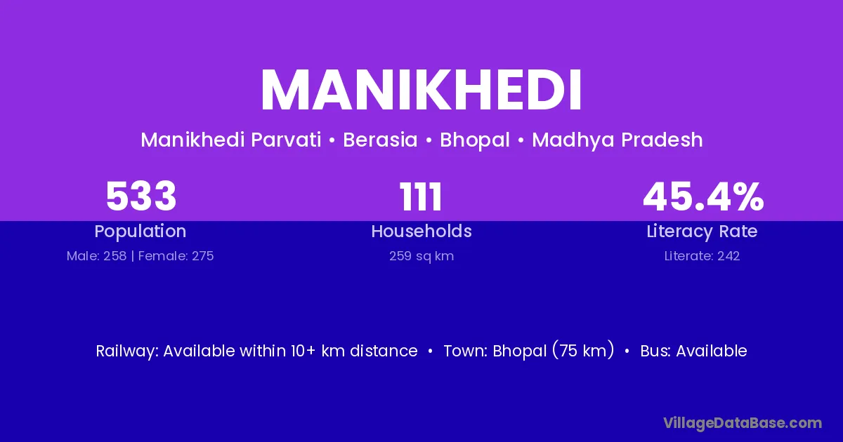 Manikhedi village has a total population of 533 people, of which 258 are males and 275 are females.